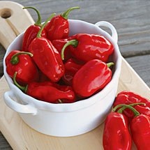 The distinctive taste of habanero without the heat! The bright and shiny red fruits are abundant on the 30" tall plants. The blocky little 1-1/2" long by 1" wide fruits will ripen from green to cardinal red in late summer. As with all hot peppers, remember to wear gloves or wash your hands thoroughly after picking or preparing these fruits.